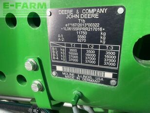 Anzahl Zylinder: 6;Arbeitsscheinwerfer: ja;Arbeitsscheinwerfer hinten: LED;Arbeitsscheinwerfer vorne: LED;Betriebsstunden: 815;Bordcomputer: ja;Druckluftbremse: ja;EHR: ja;Erstzulassung: 2024;Frontkraftheber: ja;Frontzapfwelle: ja;Geschwindigkeit: 40;Kabinenfederung: hydraulisch;Klimaanlage: Klimaautomatik;Kriechgang: ja;Load sensing: ja;Luft. Sitz: ja;Radio: ja;Reifen-h: 520/85R42;Reifen-h %: 80;Reifen-v: 420/85R30;Reifen-v %: 80;Steuergerät dw: 5;Zapfwelle: ;Zusatzsteuergeräte: elektrisch;gefederte Vorderachse: ja;;1 gebrauchter Allradtraktor;Hersteller: John Deere;Modell: 6R155;Motor: 6-Zylinder John Deere PowerTech™ 6,8 l;Leistung: 155 PS Nennleistung / ca. 168 PS Maximalleistung;Baujahr/Erstzulassung: 2024;Seriennummer: 1L06155RPRR217016;Erfassungsnummer: 166156;Betriebsstunden: ca. 815 h;Ausstattung:;0660 Ohne Frontladerpaket;0700 Ohne Frontladerausstattung;1552 AutoPowr IVT 50 km/h;1758 AutoTrac-Vorbereitung;183E JDLink-Modem;1880 Ohne Empfänger;1916 CommandCenter G5Plus mit G5Plus-Zusatzmonitor;2011 ComfortView-Kabine;2159 Premium-Sitz;2204 Hydraulische Kabinenfederung;2523 Spiegel – elektrisch verstellbar;2634 Tür mit B-Säule links und Panoramatür rechts;2670 Radio mit 6,5-Zoll-Touchscreen;2709 CommandARM mit CommandPRO und Smartphone-Halterung;3240 Hydraulikpumpe 155 l/min;3351 Fünf elektronische Zusatzsteuergeräte (SCVs);3400 Kein Mittelblock-SCV;3833 Heckzapfwelle 540/540E/1000;4113 Unterlenker mit Fanghaken;4221 Hydraulischer Oberlenker;4428 Stabilisierungsstreben – automatisch;5041 Zahnstangenhinterachse 92 mm × 2550 mm;5093 Stahlfelgen mit zwei Positionen;5270 Hinterräder 520/85R42;5905 Reifenmarke Trelleborg (vorne und hinten);6070 Allrad-Vorderachse – TLS Plus mit Bremsen und Sperrdifferenzial;6091 Stahlfelgen mit zwei Positionen;6263 Vorderräder 420/85R30;8012 Vordere Kotflügel – drehbar;8023 Kotflügelverlängerungen 275 mm;8201 Befestigungsschiene für Display;8202 Druckluftanschluss;8225 Lenkrad mit Lederbezug;8264 Kühlbox;8307 Bodenschutz für Kraftstofftank;832C Kotflügelbedienelemente für 1 Steuergerät;832D Zusätzlicher Hydraulikölbehälter;832O Vorbereitung für Zusatzdruckversorgung;835F 2. Front-SCV-Funktion für Frontkraftheber (mit Umleitungsventil);8381 Frontzapfwelle;840A 3-in-1-Schienensystem – Anhängevorrichtung mit Kugel;8405 Halter für Frontkraftheber;841J Automatische Anhängevorrichtung;841L Elektrischer Multifunktionshebel;8472 Ultimate-Frontkraftheberpaket;8701 Ultimate-Beleuchtungspaket;8726 Zwei Rundumleuchten;873O Fahrscheinwerfer auf mittlerer Höhe – H4;8751 Druckluft-Anhängerbremsanlage;8767 Variable Lenkübersetzung;878C Kennzeichenhalterung vorn;878N Überstandswarnschilder;8786 Zwei Unterlegkeile;750h-Kundendienst wurde durchgeführt;Standort: D-74214 Schöntal-Westernhausen